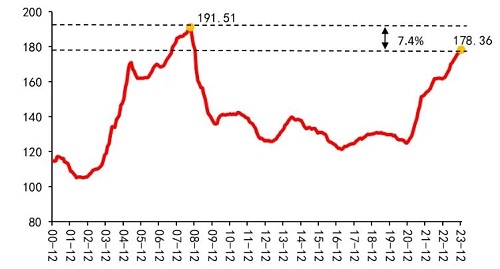 新船价格进一步上涨。12月克拉克森新造船价格指数收于178.36点,同比上涨10.2%,创2009年以来最高;仅比2008年8月的历史最高值191.51点低7.4%。分船型看,油船、散货船、集装箱船和液化气船新船价格指数分别为208.50点、165.23点、105.16点和198.07点,同比分别上涨8.4%、6.5%、3.0%和13.1%。