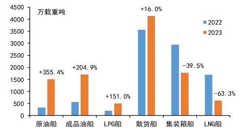 图2 2022-2023年主要船型成交情况对比 数据来源:克拉克森,中国船舶集团经济研究中心