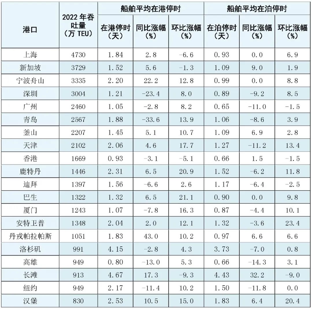 【上海航运交易所发布】2023年12月全球主要港口远洋国际集装箱船舶平均在港在泊停时