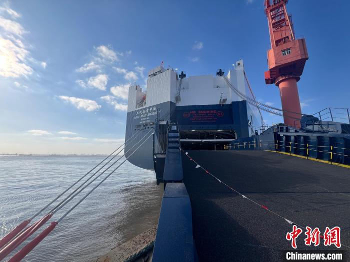 利比里亚籍“上汽安吉申城”轮7600车级滚装新造船在上海江南造船长兴基地交付(潘而东 摄)