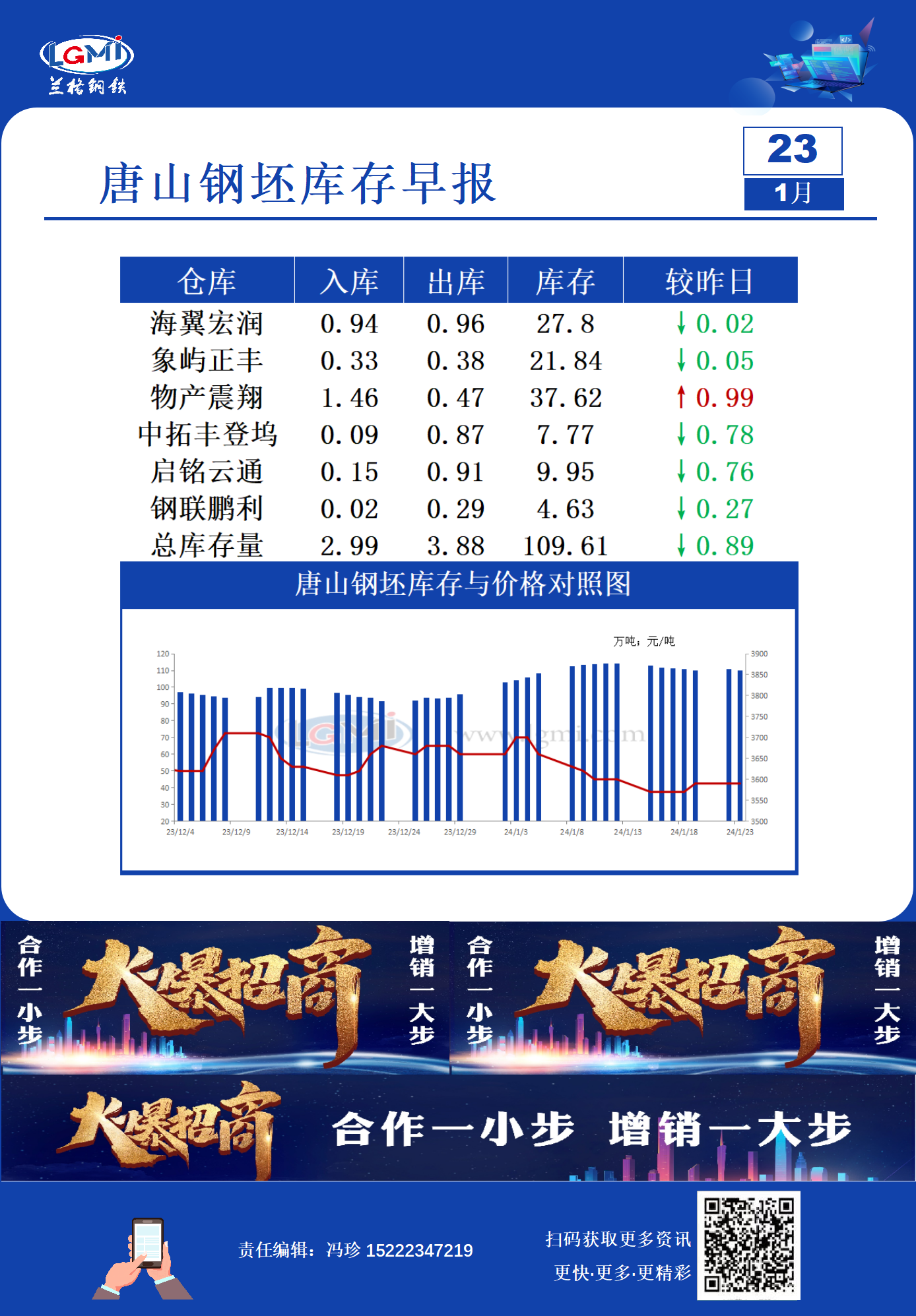 截至今晨8:00唐山地区样本仓库钢坯库存总量约109.61万吨,单日入库总量2.99万吨,出库总量3.88万吨。