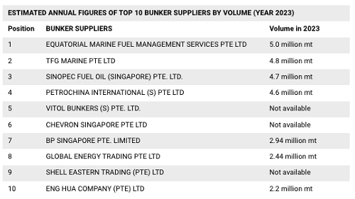 第五为维托尔燃料私人有限公司(Vitol Bunkers),Chevron Singapore上升两位排名第六,BP Singapore位居第七,Global Energy Trading排名第八,壳牌公司旗下新加坡燃料供应部门壳牌东方贸易私人有限公司(Shell Eastern Trading)排名下降四位至第九,Eng Hua Company挤掉Sentek Marine & Trading跻身第十。