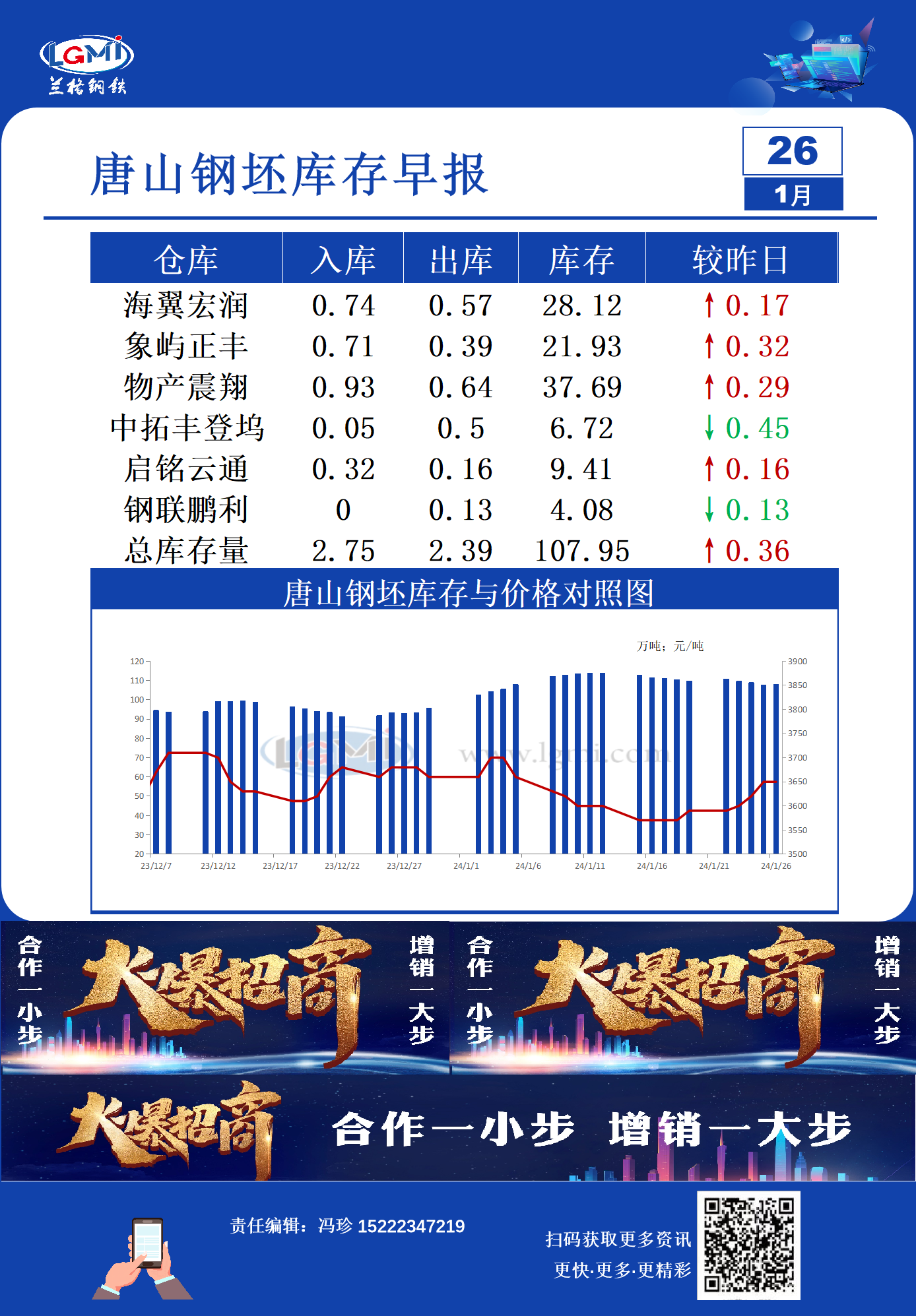 - 1月26日唐山钢坯库存早报2024/1/26