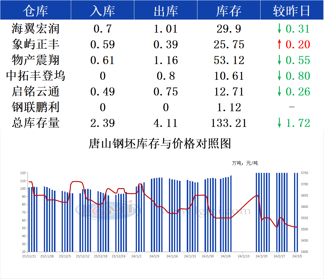 截至今晨,唐山地区样本仓库钢坯库存总量约133.21万吨,单日入库总量2.39万吨,出库总量4.11万吨。