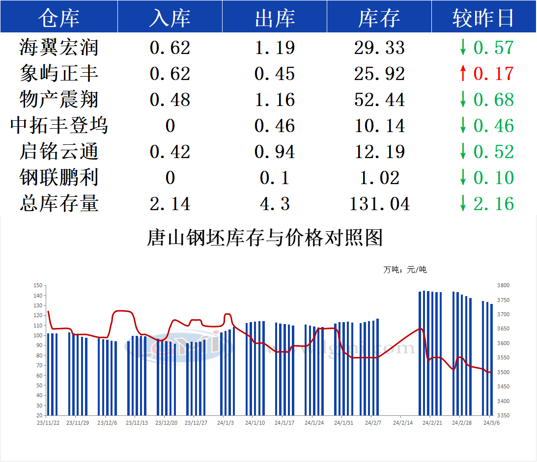 截至今晨,唐山地区样本仓库钢坯库存总量约131.04万吨,单日入库总量2.14万吨,出库总量4.3万吨。