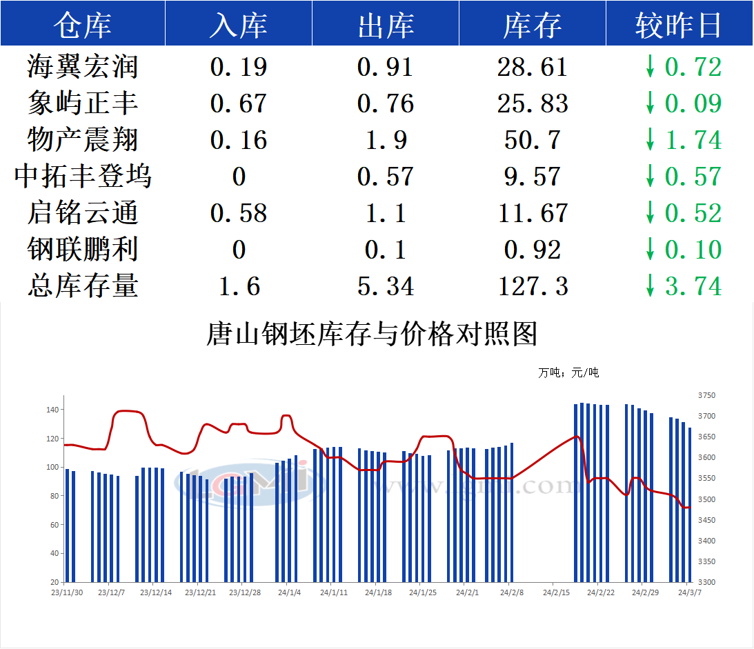 截至今晨,唐山地区样本仓库钢坯库存总量约127.3万吨,单日入库总量1.6万吨,出库总量5.34万吨。