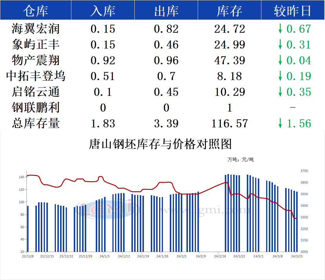 截至今晨,唐山地区样本仓库钢坯库存总量约116.57万吨,单日入库总量1.83万吨,出库总量3.39万吨。