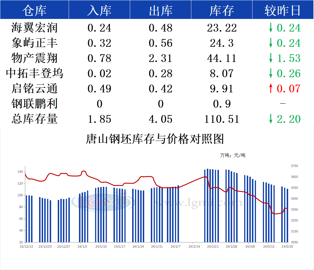 截至今晨,唐山地区样本仓库钢坯库存总量约110.51万吨,单日入库总量1.85万吨,出库总量4.05万吨。
