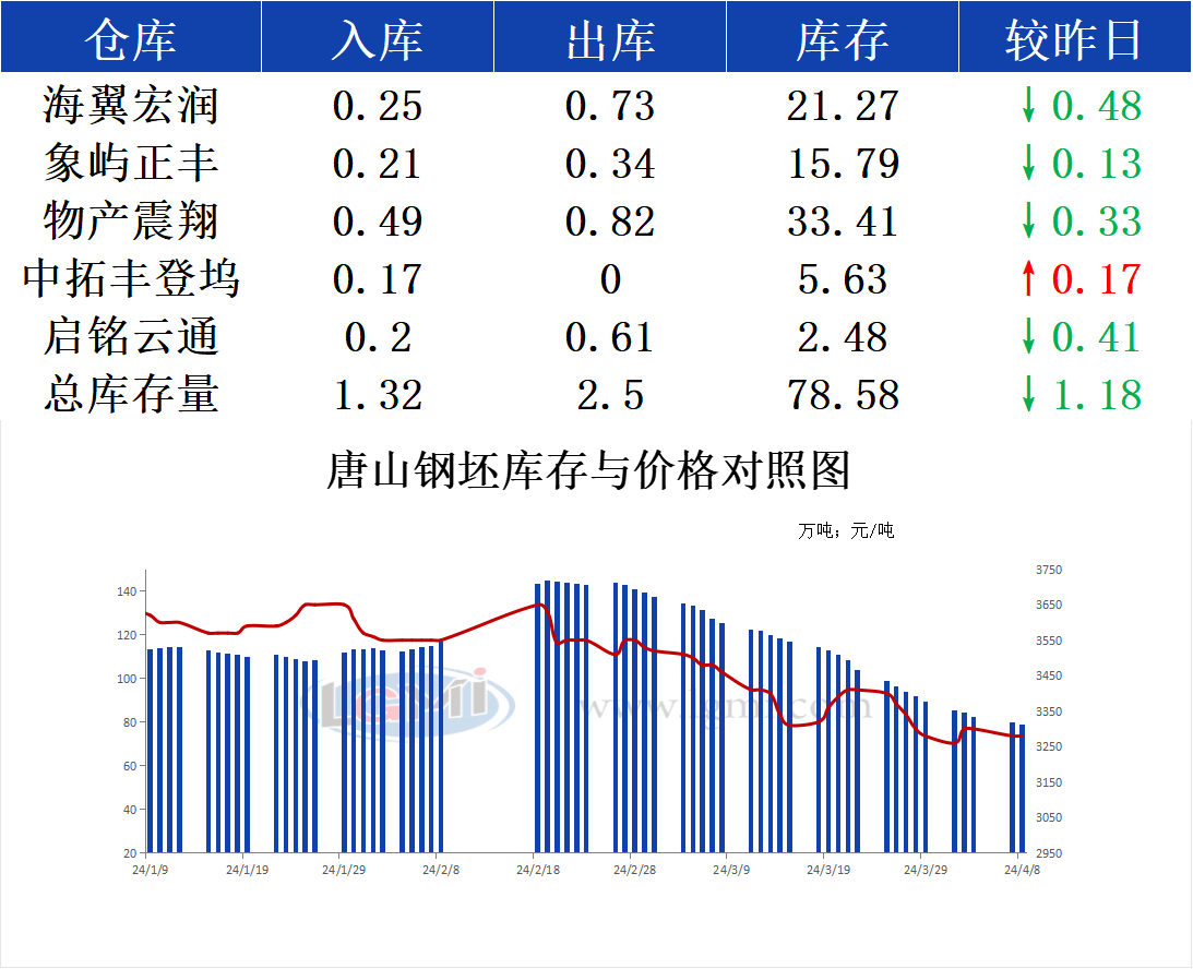 截至今晨,唐山地区样本仓库钢坯库存总量约78.58万吨,单日入库总量1.32万吨,出库总量2.5万吨。