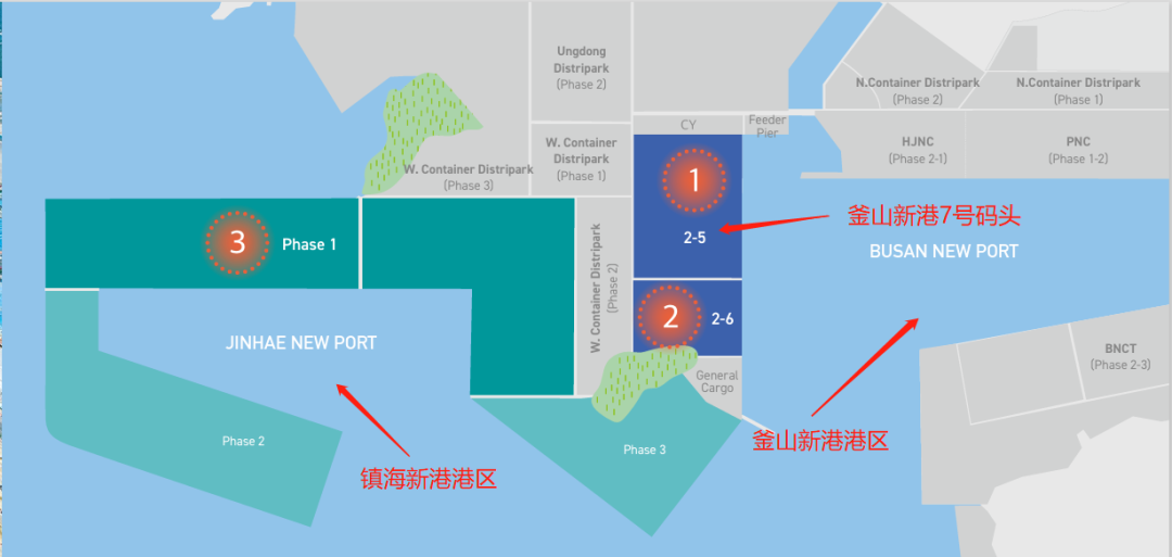 釜山港现有集装箱港区包括北港、新港,镇海新港在规划建设中
