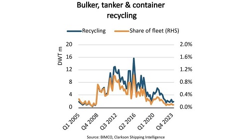 2024年第一季度,只有200万载重吨(DWT)的船舶运力被拆解,意味着船舶拆解水平连续第九个季度低于 300 万载重吨。上一次船舶拆解率长期处于这样低的水平还是在 2008 年金融危机之前。