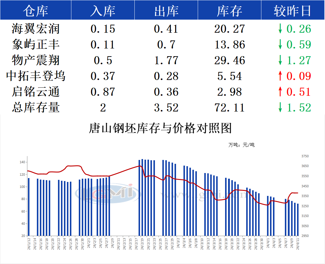 截至今晨,唐山地区样本仓库钢坯库存总量约72.11万吨,单日入库总量2万吨,出库总量3.52万吨。