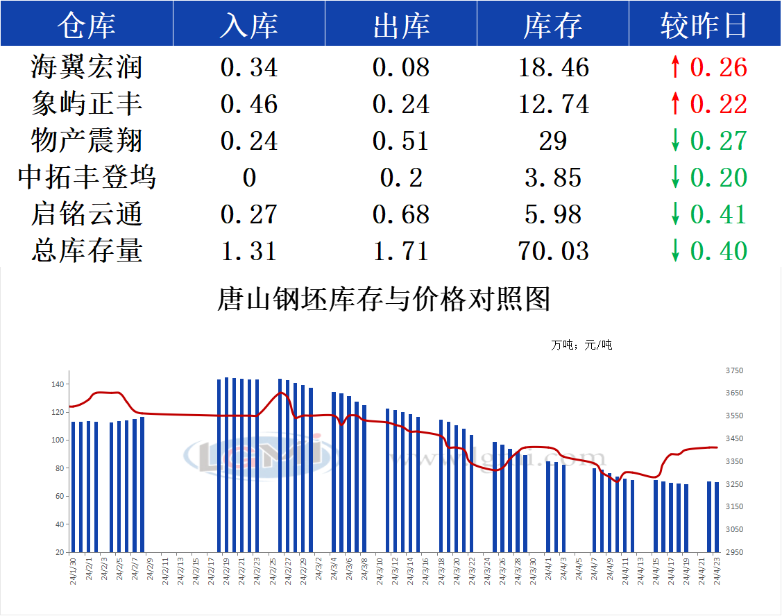 截至今晨,唐山地区样本仓库钢坯库存总量约70.03万吨,单日入库总量1.31万吨,出库总量1.71万吨。