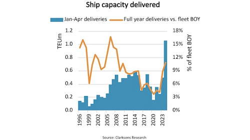 据BIMCO称,2023年交付的集装箱船运力达到了230万TEU,比之前的历史最高纪录高出37%。而今年截至目前,又创下了另一项纪录,今年前4个月的交付量已超过100万TEU,与之前的纪录相比增长了近80%。
