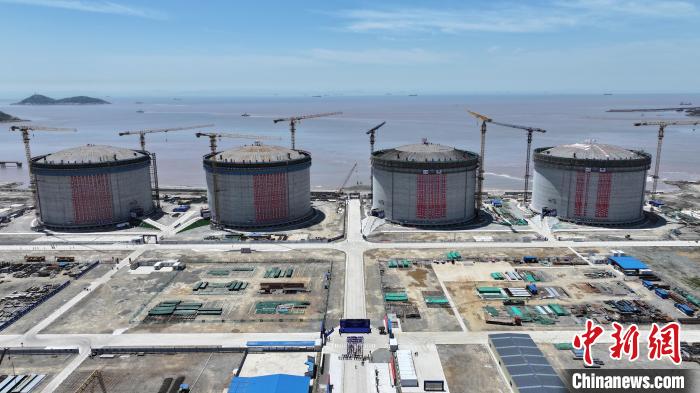 15日,位于洋山港码头的上海LNG站线扩建项目现场,4个新建储罐全部封顶。洋山港海事局供图