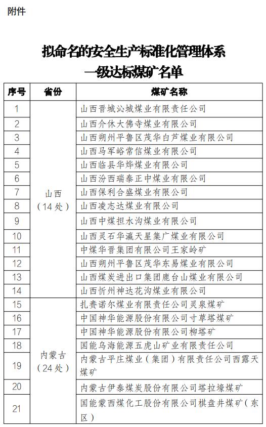 附件:拟命名的安全生产标准化管理体系一级达标煤矿名单