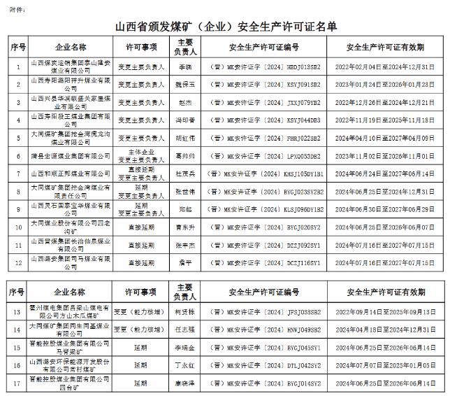 山西省应急管理厅为17座煤矿颁发安全生产许可证