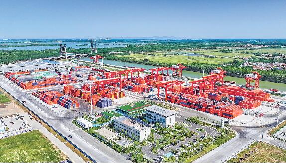 图为济宁港航龙拱港,该港已从一个散货小港发展成为北方自动化程度最高的集装箱内河港口。