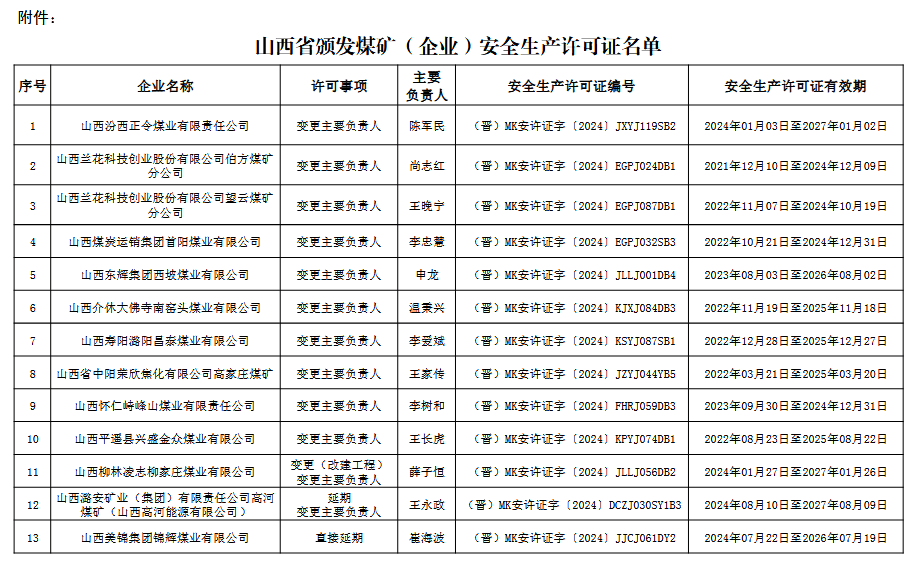山西省应急管理厅关于颁发煤矿(企业)安全生产许可证的公告