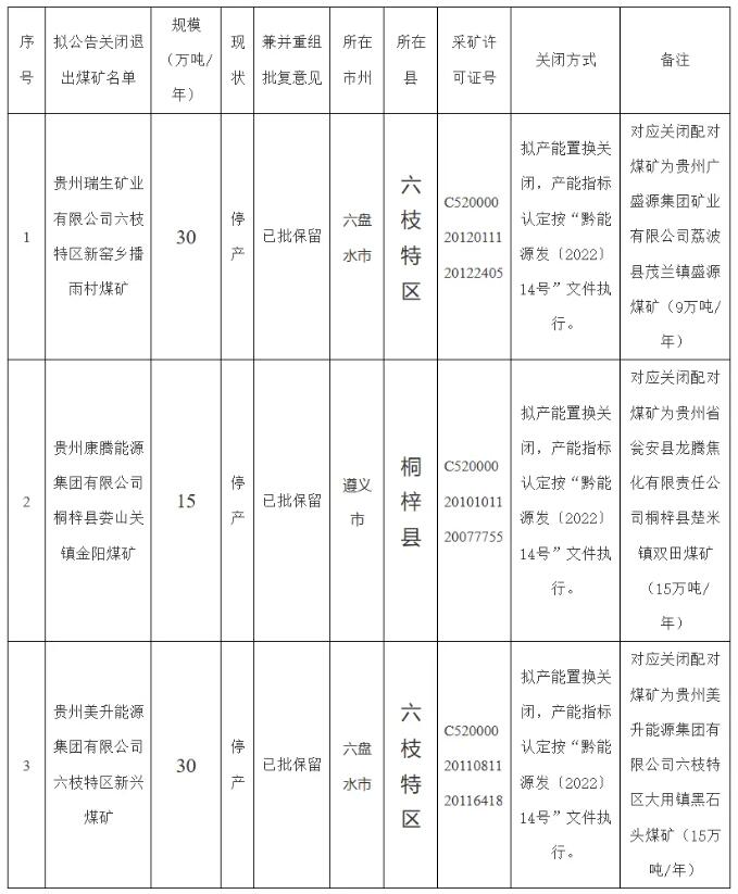 根据《国务院关于煤炭行业化解过剩产能实现脱困发展的意见》(国发〔2016〕7号)、《关于加快推进兼并重组煤矿分类处置促进煤炭产业转型升级发展的通知》(黔能源煤炭〔2020〕100号)、《省能源局关于进一步做好煤炭产能置换工作的通知》(黔能源发〔2022〕14号)等文件精神,依企业申请,经属地政府同意,现按程序对经煤矿主体企业申请的2024年第五批(前四批以原省煤炭产业结构战略性调整工作领导小组办公室名义公示)拟关闭煤矿名单进行公示(见下表),公示时间:2024年7月24日至2024年7月31日,凡对公示内容有异议者,请在公示期内以书面形式向省能源局反映(联系电话:0851—86891303)。