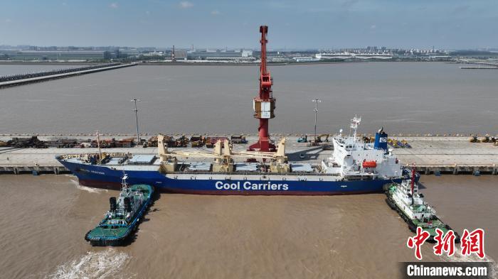 中新网上海8月7日电 (陈静 叶真于)巴哈马籍“杜鹃花”号货轮7日下午靠泊上海南港码头。这是2024年首艘靠泊上海南港码头的南非水果专船,在港期间将卸下1080多吨橙子、桔子和葡萄柚等柑橘类水果。