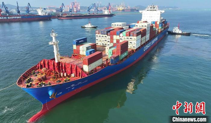 中新社烟台8月15日电 (记者 王娇妮)山东烟台至东南亚集装箱新航线15日开通,装载着393标准箱出口货物的“新湛江”轮从山东港口烟台港启程,前往东南亚国家。