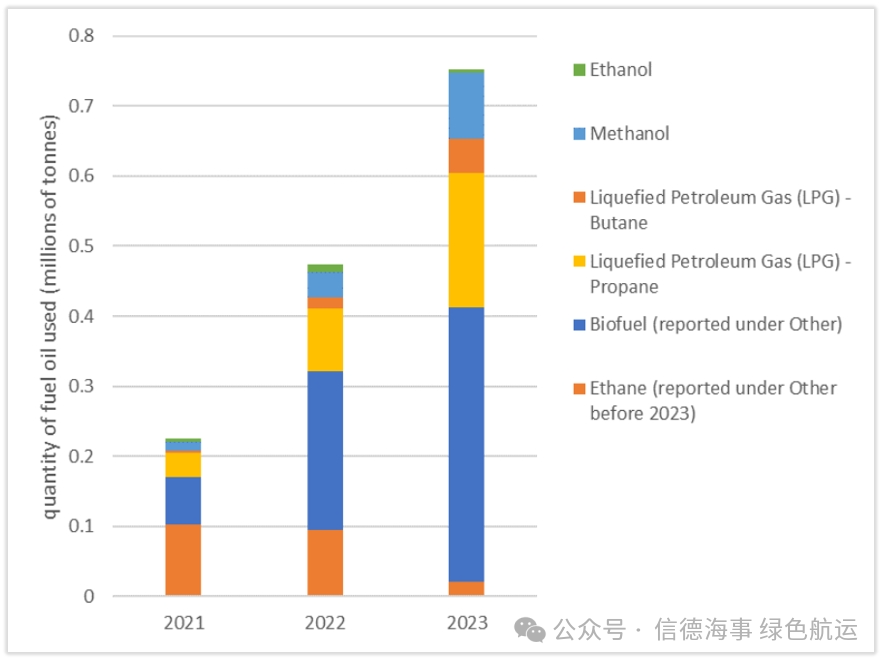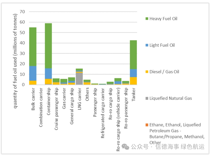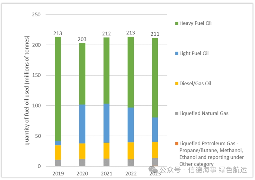 上图为不同船型在2023年对不同船舶燃料的消耗量