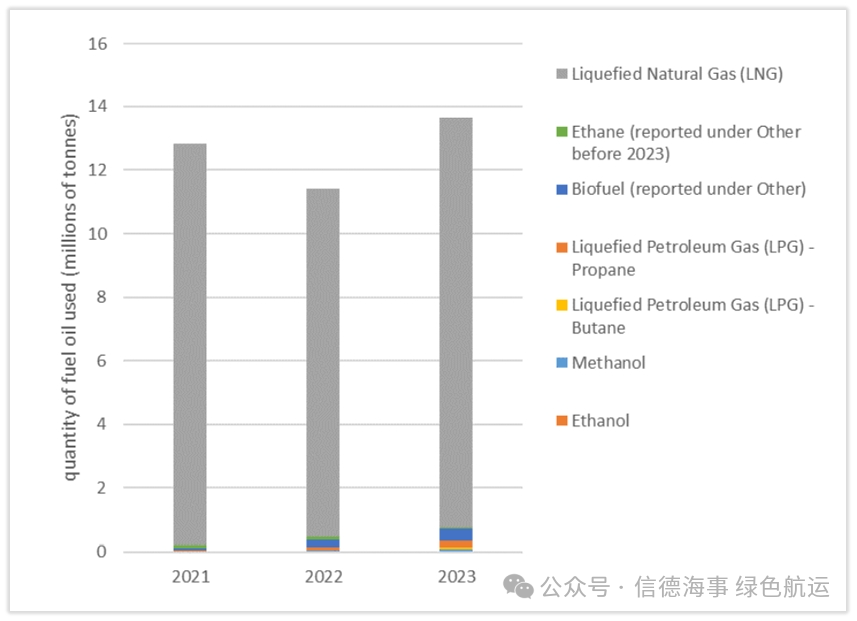 液化天然气(LNG)为12,890,011吨(2022年为10,950,408吨);液化石油气-丙烷(LPG-丙烷)为192,405吨(2022年为88,774吨);液化石油气-丁烷(LPG-丁烷)为3,49,887吨(2022年为16,673吨);甲醇(methanol)为93,876吨(2022年为35,523吨);乙醇(Ethanol)为 4,137吨(2022年为10,890吨);乙烷(Ethane)为19,036吨(2022年为95,204吨);生物燃油(biofuel)为390,846吨告(2022年为226,378吨)。