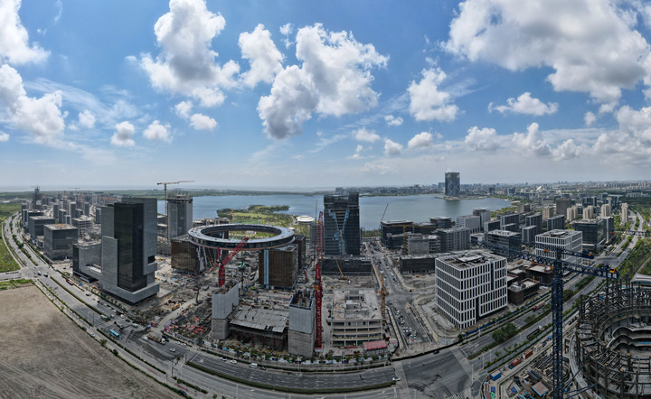 空中俯瞰临港新片区滴水湖金融湾,左为建设中的滴水湖金融湾标志性建筑“荣耀之环”(2024年8月14日摄)。本组图片均由新华每日电讯记者 方喆摄
