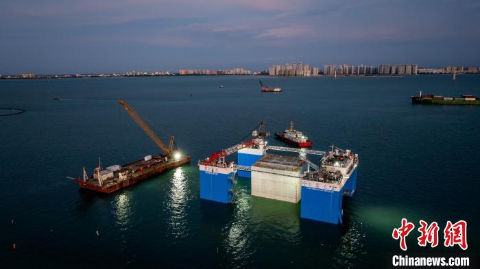 9月2日晚,海南洋浦区域国际集装箱枢纽港扩建工程完成一阶段(一期)700米码头工程沉箱安装。中交四航局 供图
