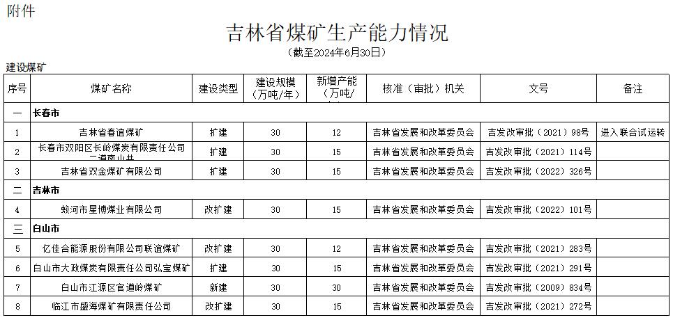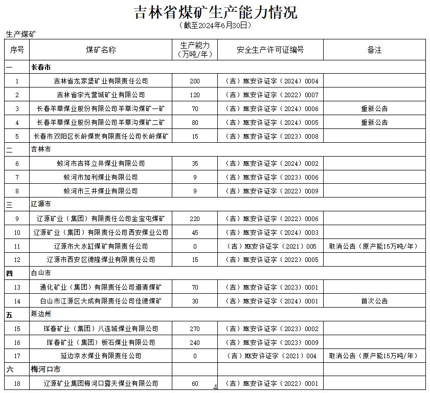 吉林省能源局关于2024年上半年煤矿产能情况的通告