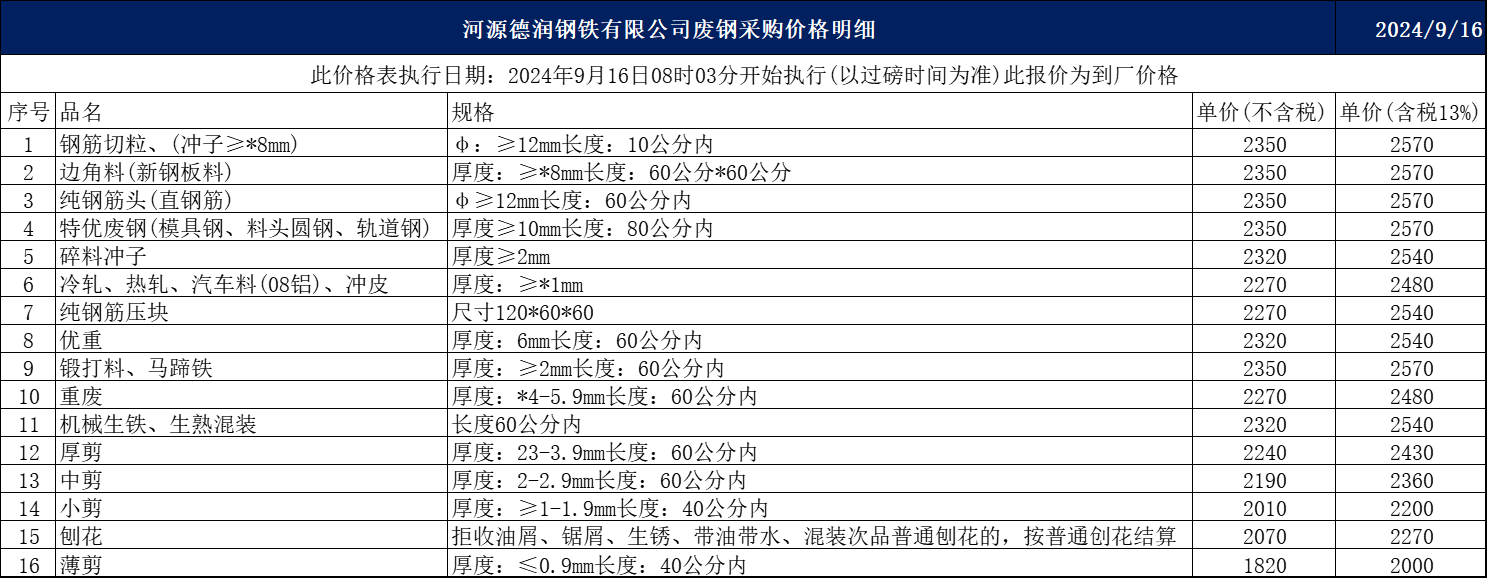 - 河源德润厂9月16日08时03分执行废钢采购价调整2024/9/16
