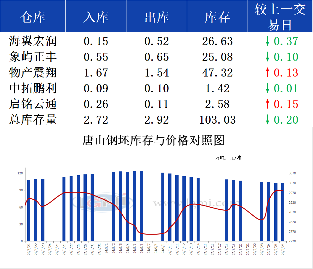 截至今晨,唐山地区样本仓库钢坯库存总量约103.03万吨,单日入库总量2.72万吨,出库总量2.92万吨。