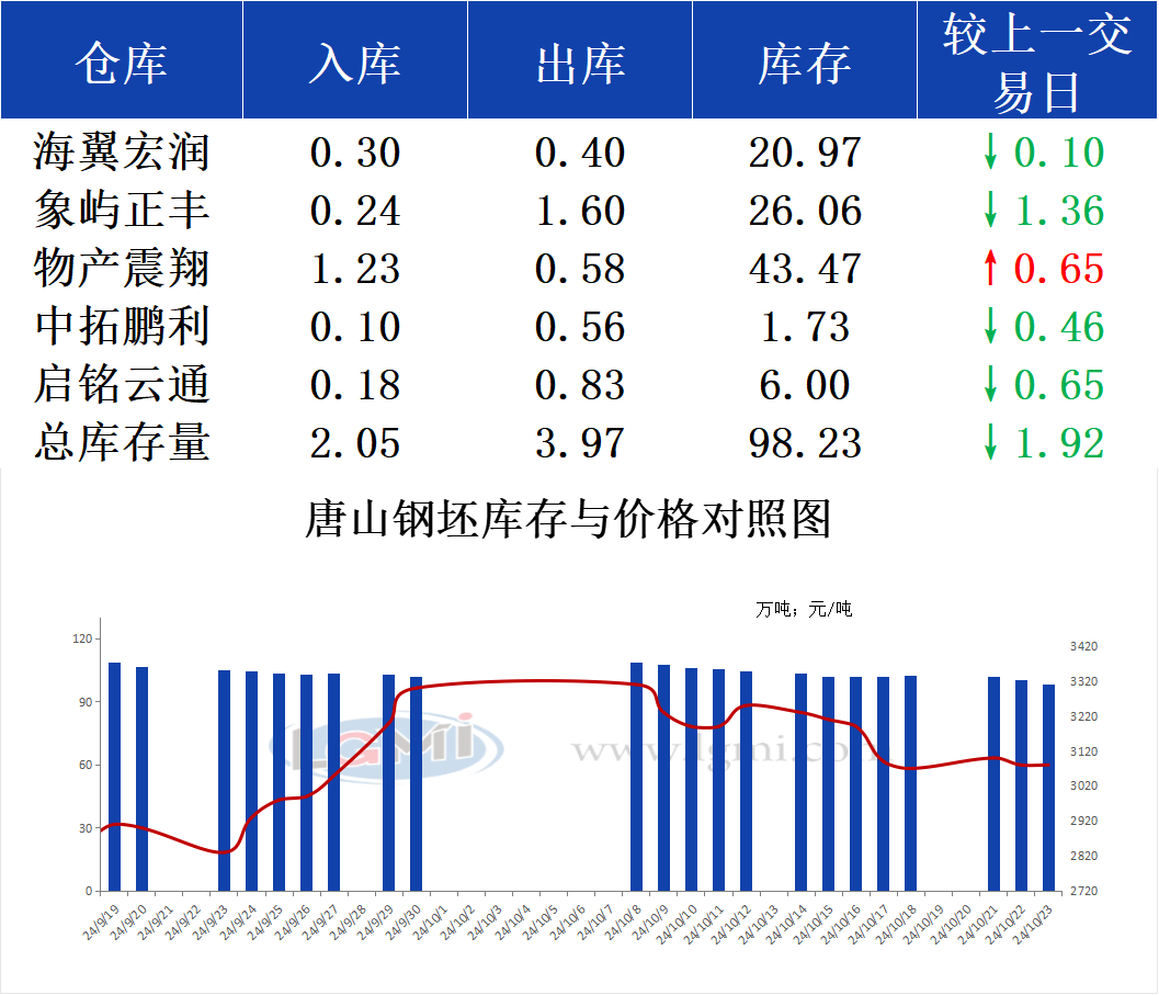 截至今晨,唐山地区样本仓库钢坯库存总量约98.23万吨,单日入库总量2.05万吨,出库总量3.97万吨。