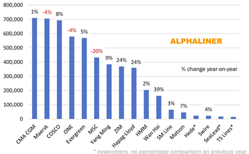与此同时,达飞集团在跨太平洋航线上的运力同比上涨1%,马士基则同比下跌4%,中远海运集团则上涨了8%。