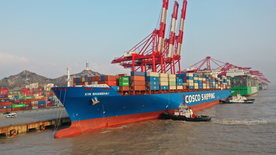 12月18日下午,中远海运“新上海”轮抵达上海洋山港。记者 李茂君 摄