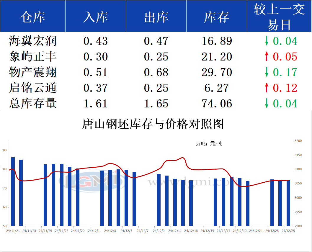 12月25日唐山钢坯库存早报