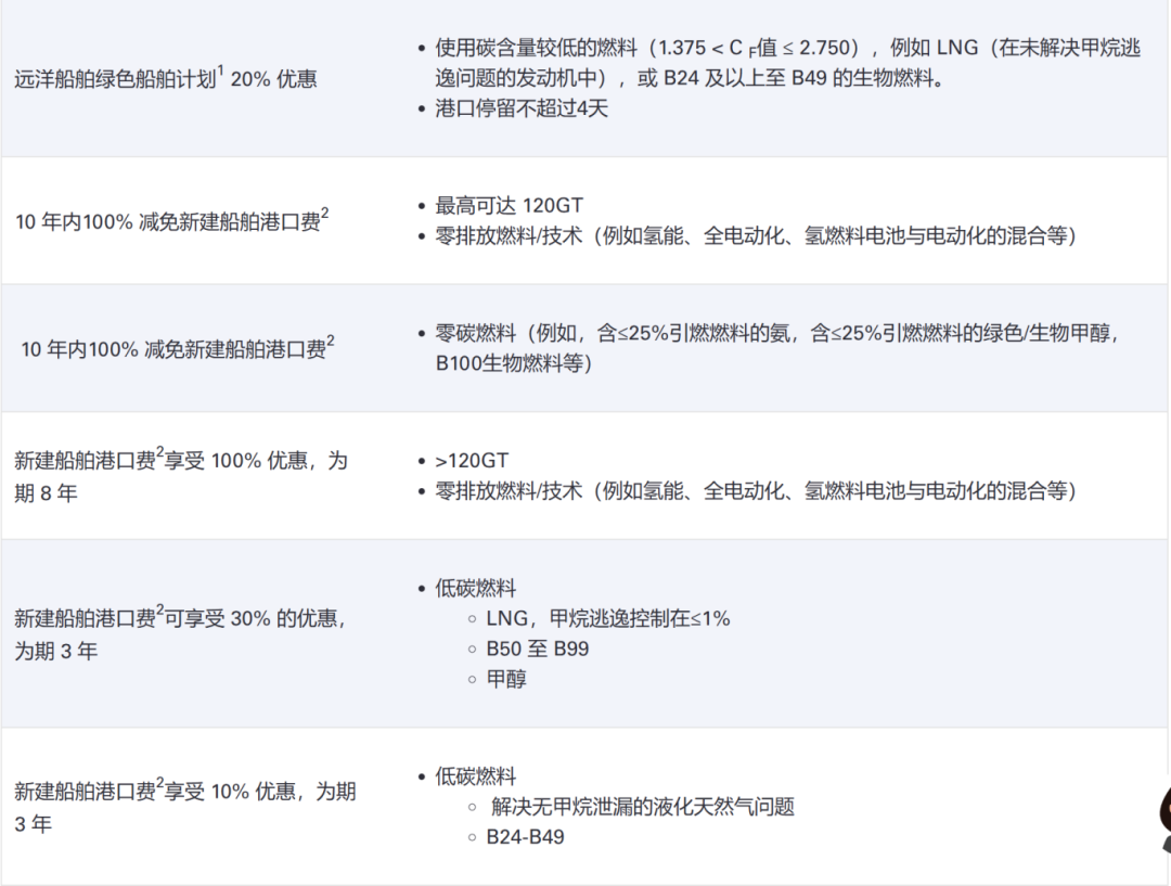 此外,使用传统甲醇、液化天然气和B50-99生物混合燃料的船舶将获得30%的折扣,而使用B24-49生物混合燃料的船舶将获得20%的折扣。