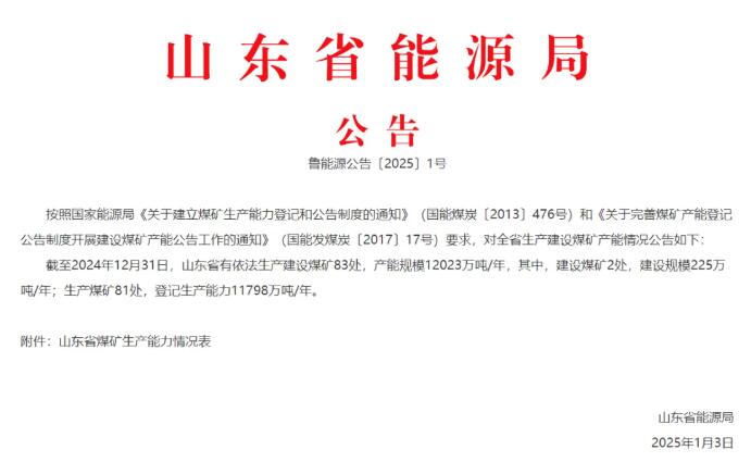 近日,山东省能源局发布煤矿生产能力公告。公告显示,截至 2024年12月31日,山东省有依法生产建设煤矿83处,产能规模12023万吨/年。其中,建设煤矿2处,建设规模 225万吨/年;生产煤矿81处,登记生产能力11798万吨/年。