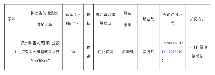 根据《国务院关于煤炭行业化解过剩产能实现脱困发展的意见》(国发〔2016〕7号)、《关于加快推进兼并重组煤矿分类处置促进煤炭产业转型升级发展的通知》(黔能源煤炭〔2020〕100号)、《省能源局关于进一步做好煤炭产能置换工作的通知》(黔能源发〔2022〕14号)等文件精神,依企业申请,经属地政府同意,现按程序对2025年第一批自愿申请关闭煤矿名单进行公示(见下表),公示时间:2025年1月8日至2025年1月14日,若发现公示信息有误,请致电更正,联系电话:0851—86891303。