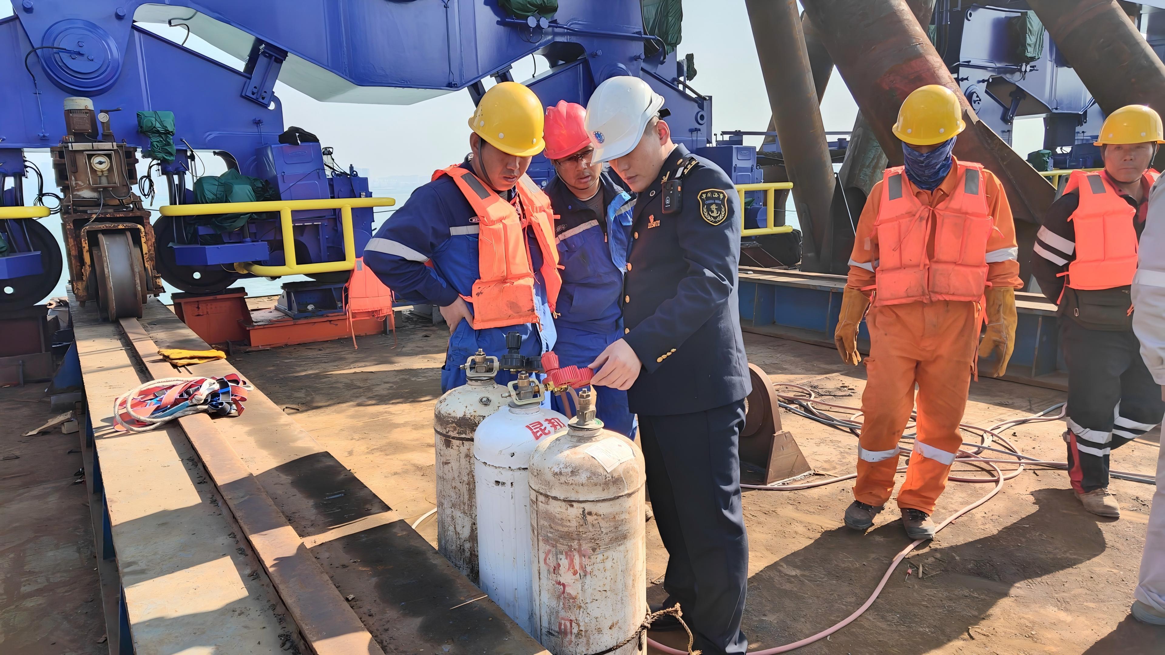 海事执法人员在吊桥安装现场。洋浦海事局供图