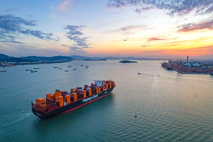 一艘20万吨级集装箱船舶在落日的余晖中缓缓驶入厦门港。厦门港口管理局供图