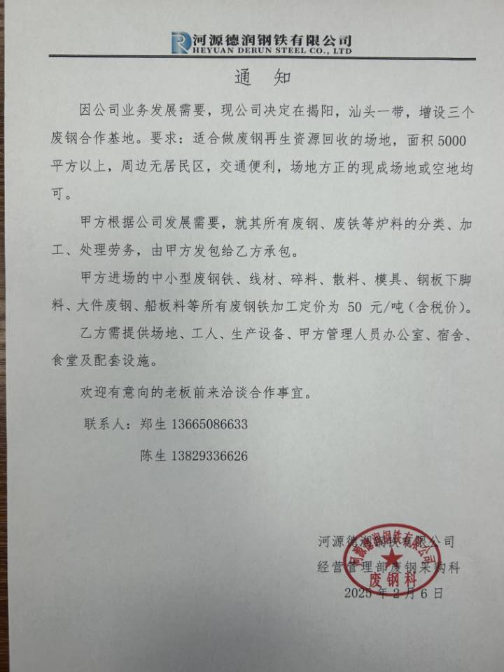 河源德润厂通知原文:因公司业务发展需要,现公司决定在揭阳,汕头一带,增设三个废钢合作基地。要求:适合做废钢再生资源回收的场地,面积5000平方以上,周边无居民区,交通便利,场地方正的现成场地或空地均可。甲方根据公司发展需要,就其所有废钢、废铁等炉料的分类、加工、处理劳务,由甲方发包给乙方承包。