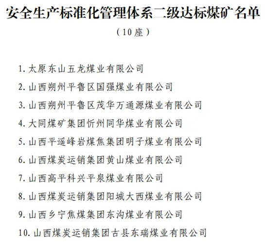 根据国家矿山安监局《煤矿安全生产标准化管理体系考核定级办法》和《煤矿安全生产标准化管理体系基本要求及评分方法》有关规定,经考核并公示,确认太原东山五龙煤业有限公司等10座煤矿(见附件)为安全生产标准化管理体系二级达标煤矿。有效期为自确认之日起3年。