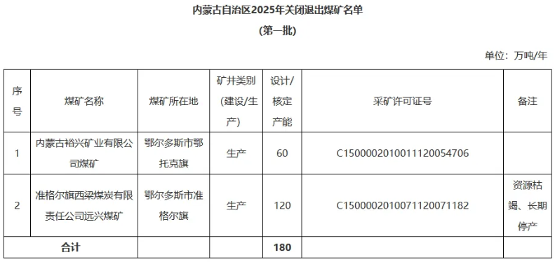 按照《国务院关于煤炭行业化解过剩产能实现脱困发展的意见》(国发〔2016〕7号)等要求,经企业申请,现将内蒙古裕兴矿业有限公司煤矿、准格尔旗西梁煤炭有限责任公司远兴煤矿列入2025年关闭退出计划,现予以公告,接受社会监督。关闭的2处煤矿均申请不享受中央和自治区奖补资金,产能指标自主交易,职工安置和债务处置工作均由企业负责,并履行矿山生态修复主体责任。请相关部门按管理权限,对有关证照、批复文件及时予以注(吊、撤)消,并进行公告;停止对其生产供电、供水。