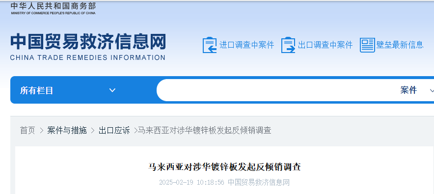 2025年2月6日,马来西亚投资、贸易及工业部发布公告,应国内生产企业CSCSteel Sdn. Bhd.提交的申请,对原产于或进口自中国、韩国和越南的镀锌板[Flat-rolled Products of iron alloy or non-alloy steel, plated or coated with zinc, using hot dip process (galvanised iron coils/sheets or galvanised steel coils/sheets) ]启动反倾销调查。涉案产品的马来西亚协调关税税号和东盟协调税则编码(AHTN)为7210.49.11 00、7210.49.14 00、7210.49.15 00、7210.49.16 00、7210.49.17 00、7210.49.18 00、7210.49.19 00、7210.49.91 00、7210.49.99 00、7212.30.11 00、7212.30.12 00、7212.30.13 00、7212.30.14 00、7212.30.19 00、7212.30.90 00、7225.92.20 00、7225.92.90 00、7225.99.90 00、7226.99.11 00、7226.99.19 00、7226.99.91 00和7226.99.99 00。