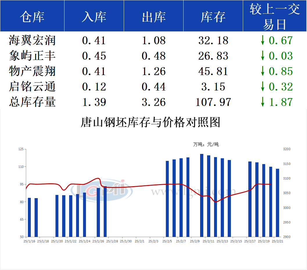 截至今晨,唐山地区样本仓库钢坯库存总量约107.97万吨,单日入库总量1.39万吨,出库总量3.26万吨。