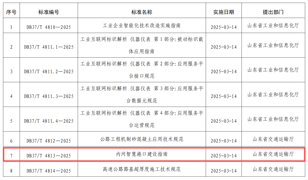 近日,山东省市场监督管理局印发《关于批准发布<工业企业智能化技术改造实施指南>等 31 项山东省地方标准的公告》(〔 2025 〕 1 号),济宁市港航事业发展中心牵头编制的《内河智慧港口建设指南》正式获批。该标准是全省内河首个省级地方标准,填补了内河航运领域标准空白,对引导和规范全省内河智慧港口建设具有指导性意义。