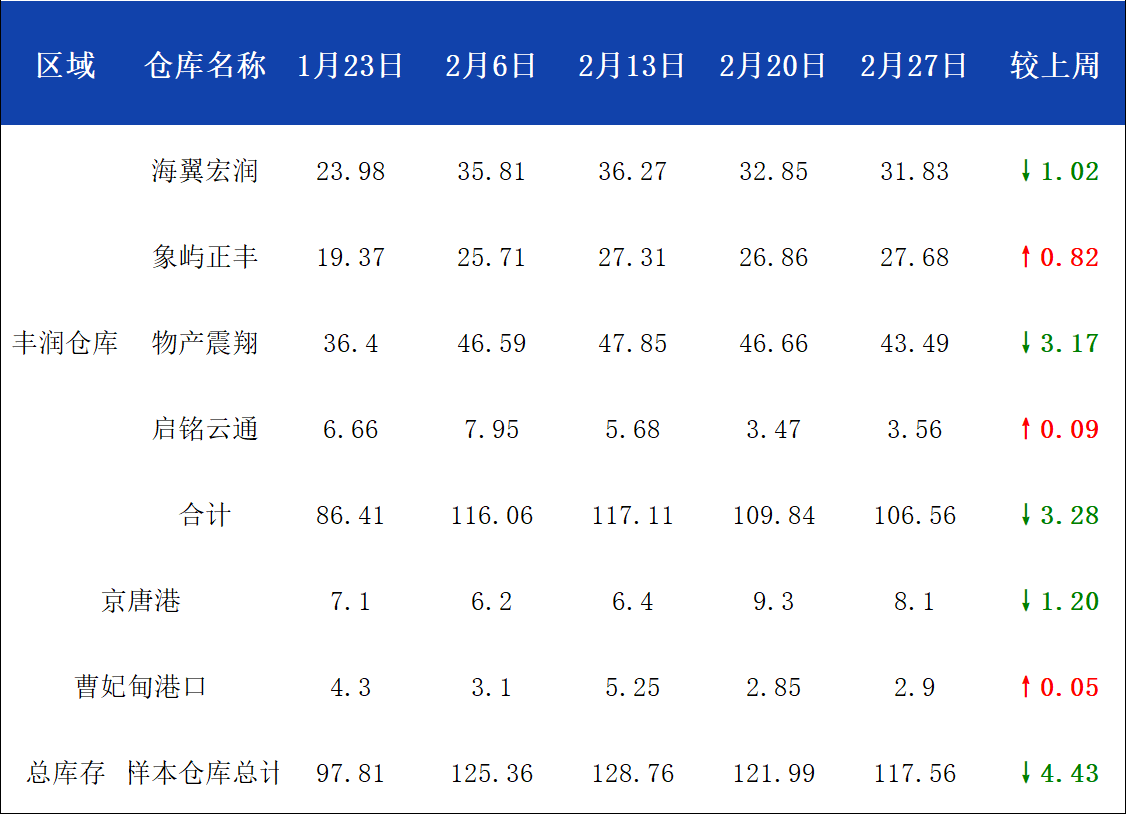 本周钢坯社会库存117.56万吨,较上期降库4.43万吨。唐山丰润仓库钢坯总库存量106.56万吨,较上期降库3.28万吨。京唐港总库存8.1万吨,较上期降库1.2万吨;曹妃甸港口库存总量2.9万吨,较上期增库0.05万吨。