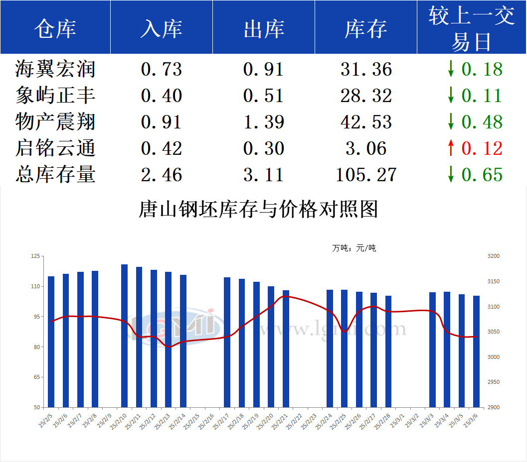 截至今晨,唐山地区样本仓库钢坯库存总量约105.27万吨,单日入库总量2.46万吨,出库总量3.11万吨。